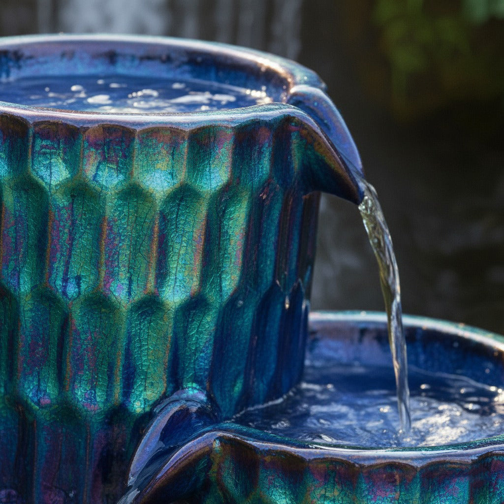 Experience the soothing ambiance of cascading water with this 53-inch handmade garden fountain. Crafted from Material: Durable Polyresin, it features a modern stacked cylinder design available in Deep Blue or Iridescent Peacock finishes. The flowing water creates a peaceful, spa-like atmosphere while adding vertical interest and artistic charm to your garden, patio, or deck. This piece combines functional water feature and decorative sculpture, enhancing both contemporary and traditional outdoor spaces.